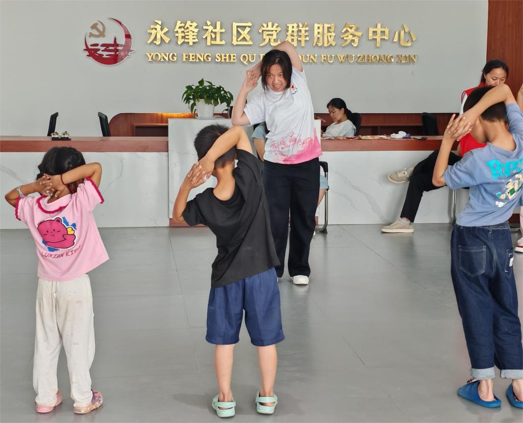 趣味游戏让知识“活”起来。围绕知识点,志愿者将枯燥原理巧妙转化为趣味指令和游戏。在脊柱神经肌肉激活训练操教学环节,“双手举高高,想象头顶冒竹笋!”等童趣化指令迅速点燃了孩子们的热情。十组精心设计的动作融入动物模仿元素,让学生们在欢快的雀跃中不知不觉完成了脊柱舒展与核心肌群激活训练,将“科学运动”理念转化为具体行动。