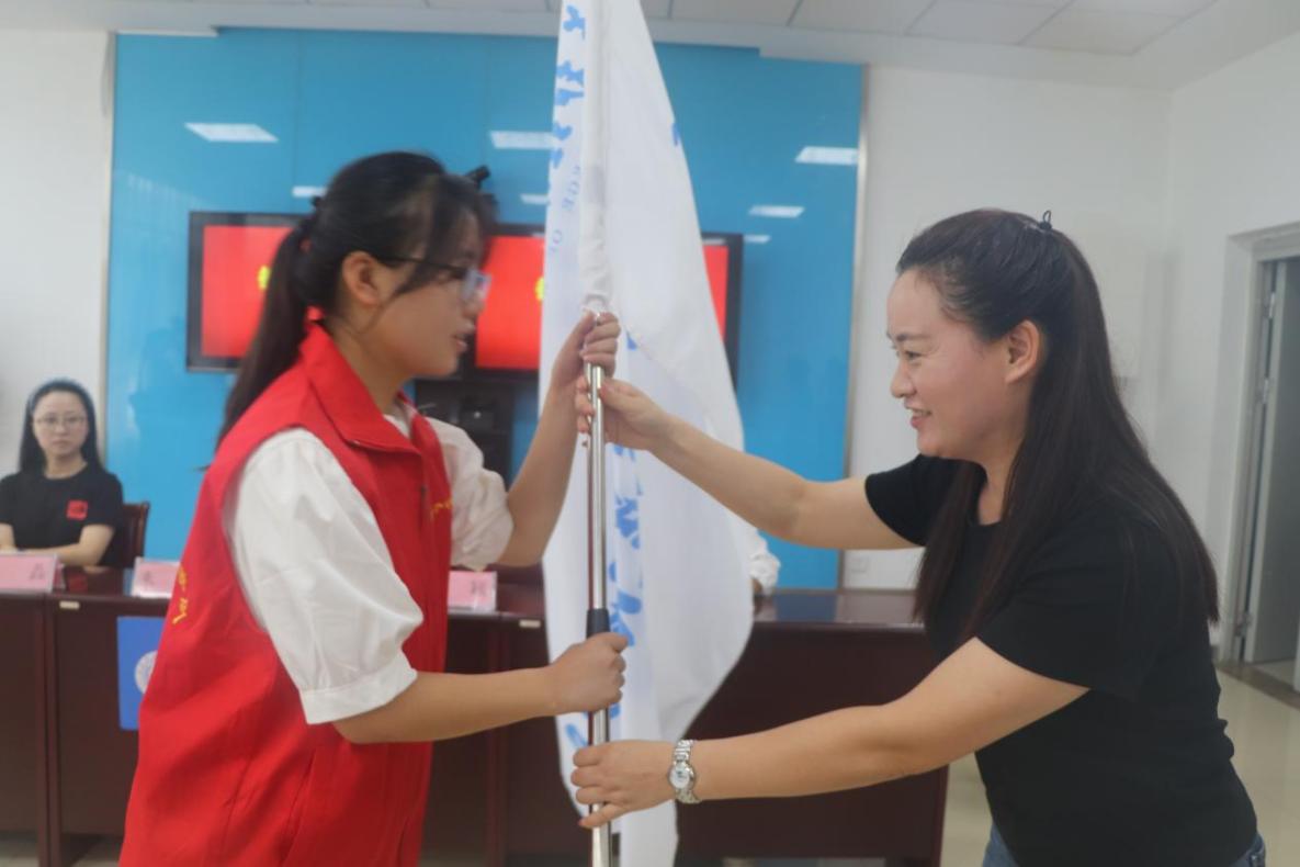 出征仪式上,全体志愿者共同宣誓,陈颖、朱敏为省级、市级及校级立项团队授旗。