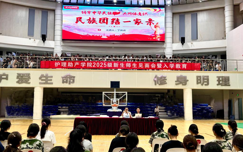 活动中,护理助产学院关工委副主任、“理响苏护”宣讲团成员丁善戎面向全体2025级新生开展校史校情与“民族一家亲”专题讲座。丁善戎以丰富的图文资料与鲜活故事,回溯学校发展历程,为同学们讲解校史校情,并表示:“学院的每一步跨越,都凝聚着前辈们的心血,希望同学们从中汲取力量,传承学校精神内核。”丁善戎结合专业特点,围绕“民族一家亲”主题,深入阐释民族团结的重要意义,他强调:“我国是统一的多民族国家,民族团结是各族人民的生命线,同学们要在未来学习和实践中,主动了解各民族的文化差异,用专业技能守护各族群众健康。”