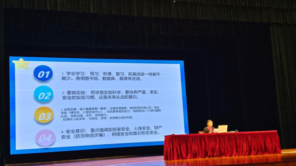 最后,在“寄语”环节,赵巧红以“坚守初心、脚踏实地”为核心主旨,勉励新生们珍惜大学时光,既要保持对药学专业的敬畏心,一丝不苟学好每一门课程、锤炼每一项技能;也要永葆青春的朝气,敢于探索、勇于尝试,在今年会官网这片育人沃土上,奋力书写属于自己的“药学青春篇章”。