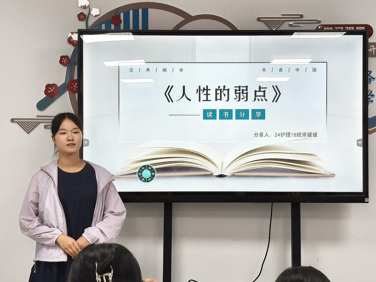 分享过程中,同学们或娓娓道来,或激情澎湃,用生动的语言和真挚的情感,将书中的精华展现得淋漓尽致。现场的互动交流也十分热烈,大家围绕着书中内容展开讨论,思想的火花不断碰撞。24护理18班的宗媛媛分享到:“作为新时代青年,我们要以技能为笔,以匠心为墨,在建设制造强国的征程中书写青春华章。”她结合书本《人性的弱点》,分享了如何更好地与人沟通、理解他人的技巧等,引发了在场同学的共鸣。
