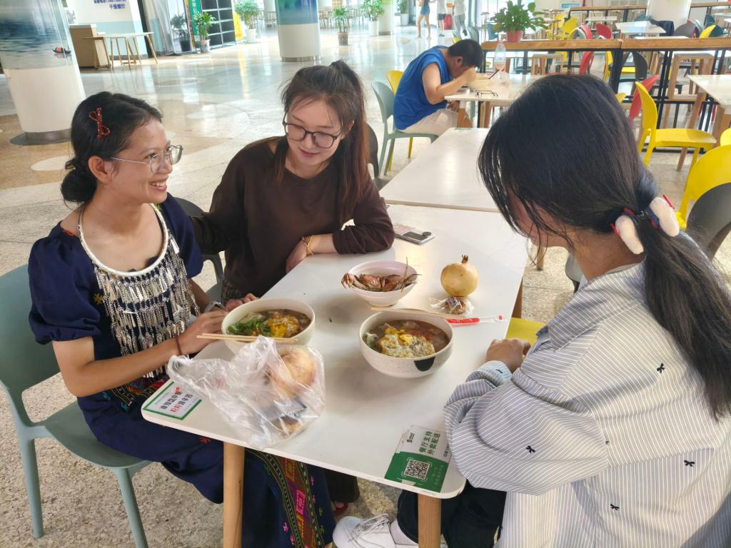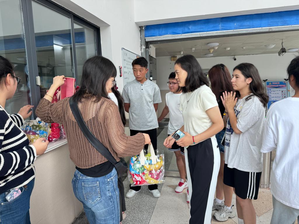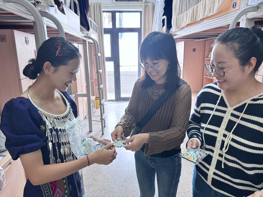 走访过程中,老师们细致询问每位同学的家乡生活、学业进展与在校适应情况,并叮嘱假期安全事项。交流结束后,老师们将一份份装有月饼、水果和暖心餐券的中秋礼包送到学生手中,承载着学院的祝福与团圆寓意。为表达感激之情,景颇族学生孙灵将富有民族特色的手工挂件回赠给老师,以物寄情,展现了民族之间的深厚情谊与文化交流。走访结束,班主任与同学们共同前往食堂共进午餐,在轻松温馨的氛围中继续畅谈,拉近了师生距离,也为本次慰问画上了温暖句号。