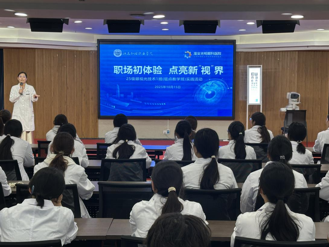 为深化课堂所学与临床实践的融合,帮助眼视光技术专业同学们明晰职业方向、接触行业前沿,10月15日下午,医学技术学院联合淮安市光明眼科医院,为2025级眼视光技术1班(驻点教学班)精心举办“职场初体验 点亮新‘视’界”主题实践活动。淮安市光明眼科医院副院长姜苏、副院长张曙光、视光科主任蒋笑、特检科主任祁子恒等医院领导和带教老师与学院44名师生共同参与活动,开启了同学们职业认知沉浸式体验新旅程。