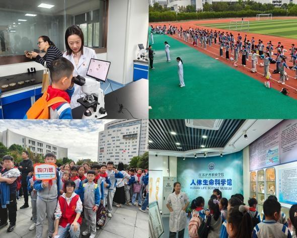 活动期间,学生们在志愿者的有序引导下分批沉浸式体验多元项目。在生命科学馆,借助人体模型与器官标本,学习人体结构知识;在医学技术学院实训室,用显微镜观察手上细菌,志愿者同步示范七步洗手法并讲解细菌防护要点;置身智慧医护实训基地,孩子们聆听中医名家故事、辨识常用中药材的特性,沉浸式体验思政 VR 课程;在操场,跟随志愿者练习易筋经、太极拳基础动作,沉浸体验中医养生与现代健康之道。