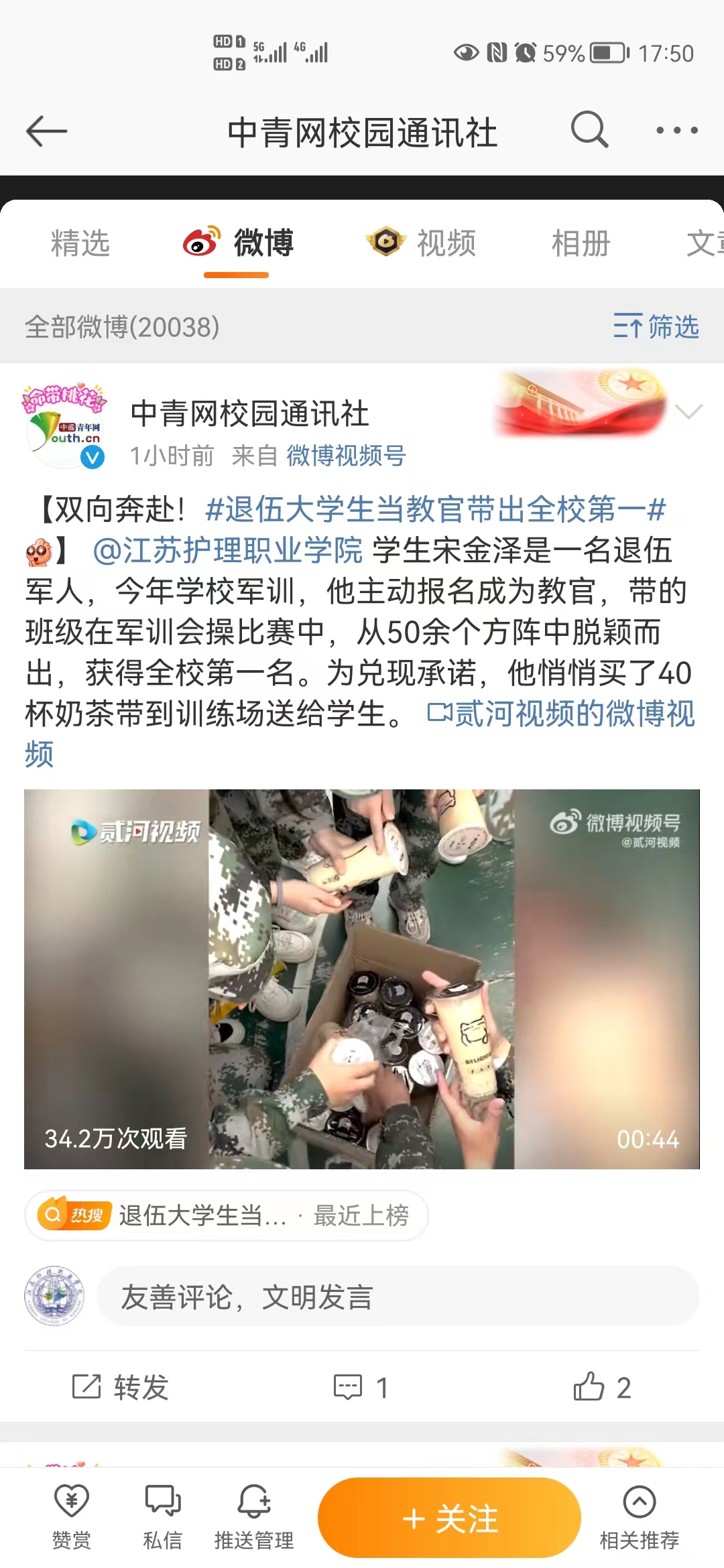 【人民日报客户端】双向奔赴!新生军训获第一教官送40杯奶茶