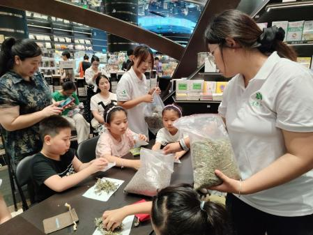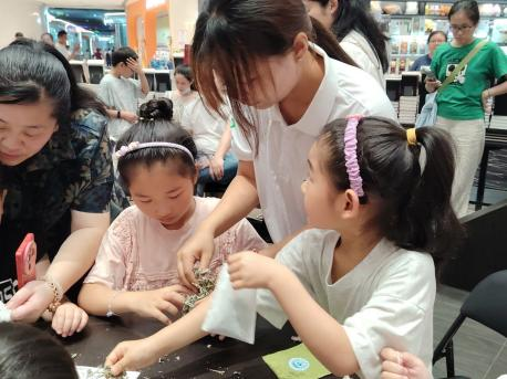随后,志愿者带领小朋友们围坐在一起,制作中草药香囊。在志愿者协助下,小朋友们精心挑选艾叶、薄荷等中药饮片,亲手制作出具有驱蚊、安神等功效的香囊。把学到的知识化为手中实实在在的作品,小朋友们心中涌起沉甸甸的成就感。